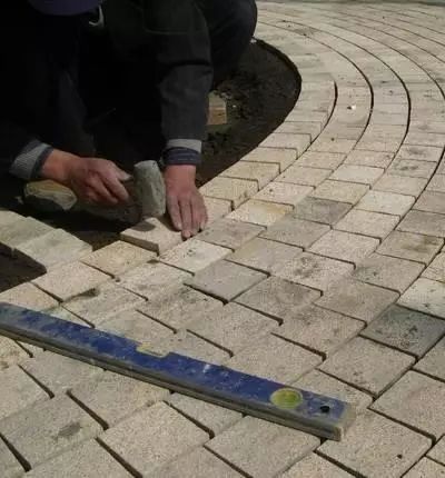▲平面鋪裝涉及到曲線段時為了保證拼縫方向與行走方向一致,鋪裝石材必需使用弧形板過渡。