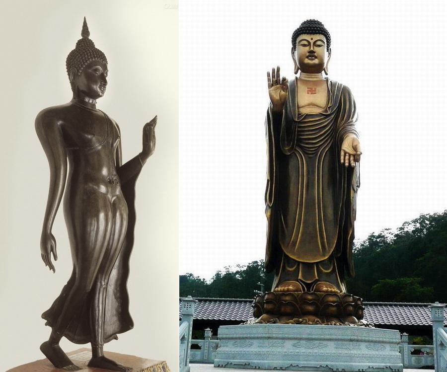 佛立像本于釋迦佛游行說(shuō)法的姿勢(shì)。相傳釋迦成道后,在西北印度各地游行說(shuō)法四十九年。所以佛的立像多為一腳向側(cè)前略伸,表示步行的樣子,一般稱之為行徑像。還有一種雙腳并立于蓮花臺(tái)上,雙手作接引狀,這大多是阿彌陀佛像,表示接引往生西方極樂(lè)世界的意思。在尊像旁,有一種站立合掌的菩薩或弟子的像,這稱之為侍立像。此外,各種護(hù)法天神的像多為立像,其姿勢(shì)則有各種各樣。