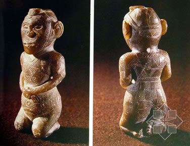 1979年在遼寧咯左旗大城子鎮(zhèn)東山嘴紅山文化(距今5,000多年 )遺址,發(fā)現(xiàn)了兩件小型孕婦像和20多件人像殘塊(左腿疊于右腿盤膝正坐,雙手交叉于腹部)。這里是進行祭祀活動的場所,方形基址是祭奉地母神的祭壇,而圓臺可能是供奉生育神或農(nóng)神的祭壇。女像的頭部、右臂及膝下已殘缺,體形肥碩的一件表面磨光,著紅彩。