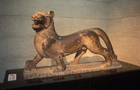 藏王墓位于西藏自治區(qū)瓊結(jié)縣,是公元七——九世紀(jì)歷代吐蕃贊普的墓葬群,現(xiàn)存石獅一對(duì)和石碑、柱等。造型除受中原影響外,樣式特征亦帶有波斯風(fēng)格影響。