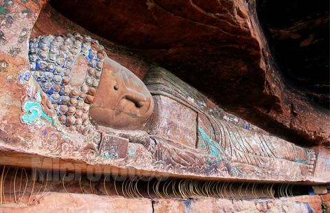 臥佛院摩崖造像位于四川省安岳縣城北面25公里的八廟鄉(xiāng)臥佛溝,以其臥佛大像和石刻佛經(jīng)聞名于世。臥佛鐫刻在距地面5米的崖壁上,全長23米,頭長3米,肩寬3.1米。它 背北面南,頭東足西,左側而臥。臥佛形體修長,身著袈裟,面部豐盈,神態(tài)安祥,雙目微閉,似睡非睡,展現(xiàn)出釋迦牟尼涅槃時那超脫一切的意境。臥佛溝南面的 石壁上,有15窟經(jīng)龕,規(guī)模大小不等。刻經(jīng)面積達130多平方米,經(jīng)文目錄繁多,內(nèi)容極其豐富。主要經(jīng)目有《大唐東京大敬愛寺一切經(jīng)論目序》、《佛名 經(jīng)》、《大般涅槃經(jīng)》、《般若波羅密多心經(jīng)》、《佛頂尊勝陀羅尼經(jīng)》、《妙法蓮花經(jīng)》等。這裡是我國寶貴的石刻經(jīng)庫。 (資料來源:石工坊雕刻)