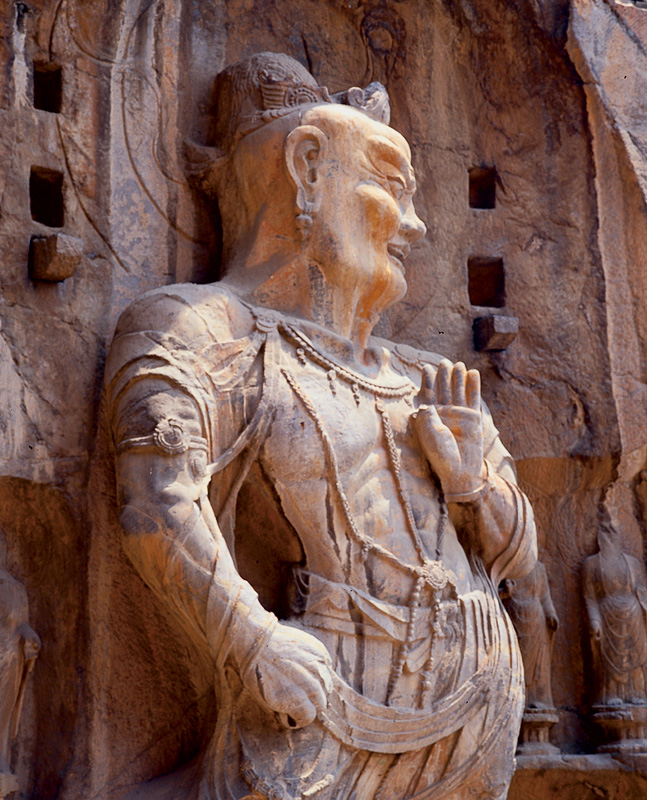 傳神是中國藝術的最高審美要求。面部表情是最能表現(xiàn)人的思想感情的,佛的莊嚴、觀音的慈祥、憤怒的天王、騾悍的力士都要通過人的眼神、嘴唇的微妙變化傳達出來,當然,眼睛離不開五官的諧和,神態(tài)也離不開身姿手勢的表征。除個體形象本身的傳神之外,傳神還表現(xiàn)在人物關系之間及巨幅造像的整體意境中。