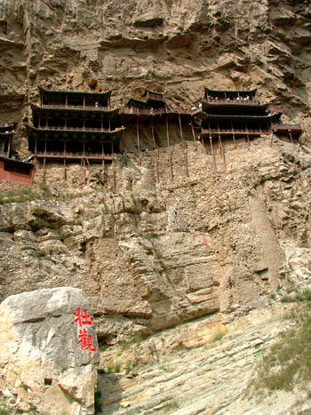 懸空寺,懸掛在北岳恒山金龍峽西側(cè)翠屏峰的半崖峭壁間,始建于北魏太和15年(公元491年),始建初期,最高處的三教殿離地面90米,因歷年河床淤積,現(xiàn)僅剩58米。1957年列為山西省重點(diǎn)文物保護(hù)單位,1982年,列入全國重點(diǎn)文物保護(hù)單位。整個(gè)寺院,上載危崖,下臨深谷,背巖依龕,寺門向南,以西為正。全寺為木質(zhì)框架式結(jié)構(gòu),依照力學(xué)原理,半插橫梁為基,巧借巖石暗托,梁柱上下一體,廊欄左右緊聯(lián)。