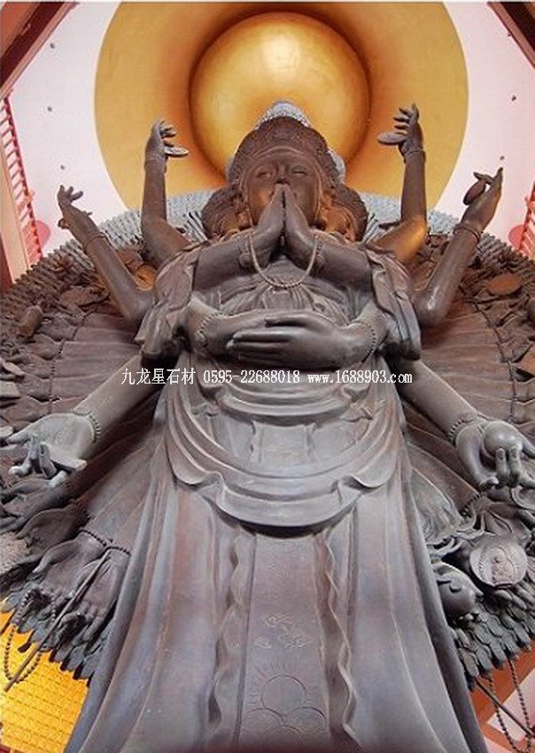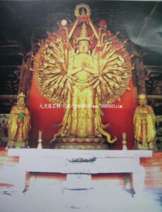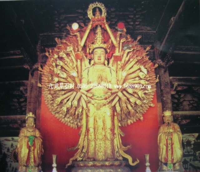 千手觀音是我國民間信仰的六大菩薩之一。千手觀音是阿彌陀佛的左脅侍,與阿彌陀佛、大勢至菩薩(阿彌陀佛的右脅侍)合稱為“西方三圣”。據(jù)佛教典籍記載,千手觀音菩薩的千手表示遍護(hù)眾生,千眼則表示遍觀世間。