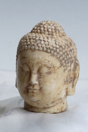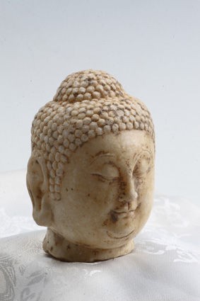 佛造像是佛教的載體,通過對佛造像年代、工藝、造型及風(fēng)格的研究,有助于認(rèn)識和了解古代雕刻藝術(shù)、文化史,古人的審美情趣以及古代的政治、經(jīng)濟(jì)和科技發(fā)展水平??v觀佛造像制作材料,有木制、泥塑制、金屬制、牙骨制、陶瓷制和石制。其中以石刻雕制的難度最大,因為它涉及石料的選擇、開采、運(yùn)輸,體大量重,雕刻打磨實屬不易。唐代石刻佛造像是把人與精神、現(xiàn)實與理想完美地結(jié)合在一起的最佳表現(xiàn)形式。那么就請大家一同欣賞這尊唐代漢白玉佛首的神韻和藝術(shù)感染力以及由此帶給我們大家的宗教、歷史、文化等方面的信息吧。