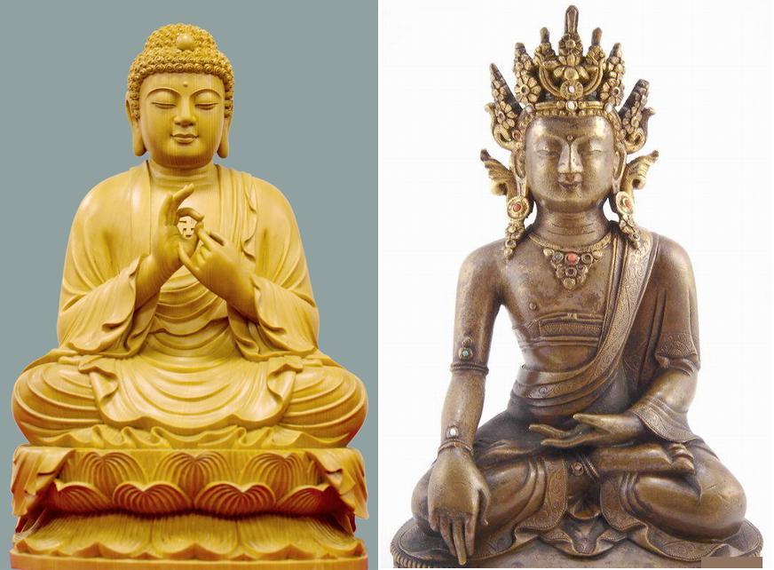 這些佛沒有太多的固定標幟,阿彌陀佛一般是雙手重疊置膝上作禪定手印;毗盧遮那佛雙拳握抱,兩手食指相并,稱智拳印;藥師佛右手往往捻一藥丸或左手托一小缽;其他的佛作說法印或作施無畏印。按佛經(jīng)上說,只有降魔印、說法印、禪定印、施無畏印、與愿印等五種基本手印,各佛皆可使用。
