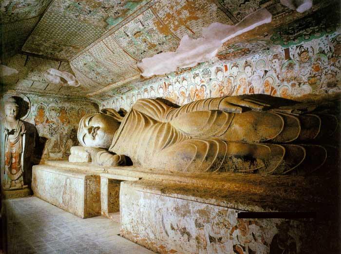 臥像一般表示釋迦佛在住世多年,最后去世涅槃時的情況。其姿態(tài)大多為右脅而臥,有的還在其身后塑繪出眾多弟子悲哀哭泣的形狀,以表現(xiàn)他們對佛涅槃的悲傷心情。