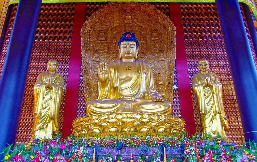 三佛──在大雄寶殿內(nèi)三尊佛像并排而坐。不論漢傳及藏傳佛教,一律都是如來相。諸佛可從手印、標幟和座次來確認。