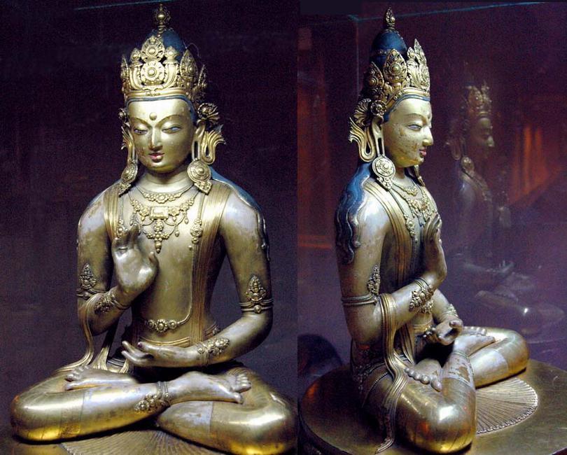 元代統(tǒng)治階級信奉藏傳佛教,但對其它宗教信仰采取寬容態(tài)度,因而傳統(tǒng)的佛教藝術(shù)仍得到繼承和發(fā)展。同時,藏傳佛教密宗,與傳統(tǒng)佛教顯宗并存,使佛教造像亦有增益?!皾h式造像 ”繼承了唐宋傳統(tǒng)風格,漢化佛教特征更加明顯;“梵式造像”受到印度巴拉王朝作風的影響,有其特定的儀軌,雖與“漢式造像”有些共同點,但從外表形象到內(nèi)在的精神狀態(tài),從面型、體型、姿態(tài)、服飾、執(zhí)物,到背光、蓮座乃至龕形,大多顯露出梵式藏傳佛教造像的特征。到了明代,東傳的“梵式”已與“漢式”融合一起,佛教造像進一步漢化。清代,“梵式造像”與“漢式造像”并存不悖,各領(lǐng)風騷。特別是一些鎏金銅造像,制作精美,光彩奪目,有的還鑲嵌珍珠寶石,十分寶貴。
