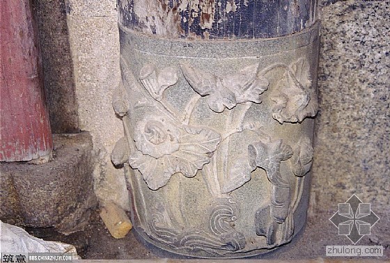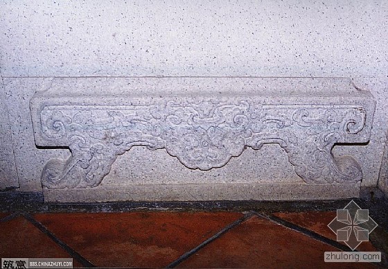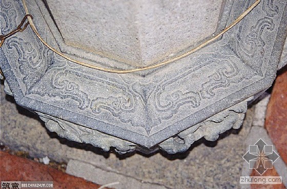 | 圖中左右兩個(gè)壁柱下石作下段也一樣,稍小。和須彌座的圭角一致的是都立于土襯石上。按照劉大可《中國(guó)古建筑瓦石營(yíng)法》標(biāo)準(zhǔn)的須彌座的圭角用如意云。倒是圖中形狀有象龜腳之處;整體應(yīng)該是仿幾案。臺(tái)灣研究閩南古建的學(xué)者稱(chēng)之為“柜臺(tái)腳”。