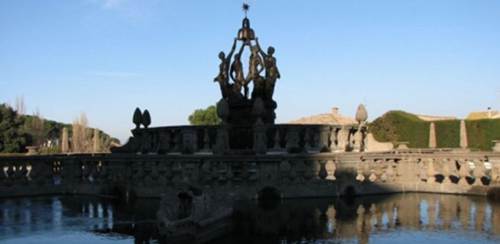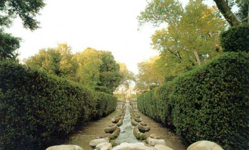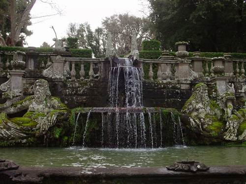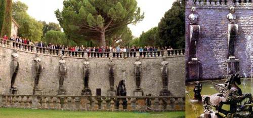 噴泉:蒙塔爾托主教入主別墅時期,他按照當(dāng)年維尼奧拉的整體設(shè)計,繼續(xù)建造花園的中央噴泉--意大利風(fēng)格主義雕塑家詹博洛尼亞(1529-1608)設(shè)計建造的"摩爾噴泉":4個石欄圍繞的水池,石欄上矗立著石雕花瓶,4個水池中央便是一組高聳的年輕運動員的輝煌雕塑,他們高高舉起象征著蒙塔爾托主教家族姓氏的"阿爾托山"。從遠(yuǎn)處看去,這些有力的塑像十分宏大,黑黝黝地閃耀,以至于人們會認(rèn)為它們是青銅,可是難以置信的是,它們是最好的、最堅硬的石灰華在陽光與水的作用下生成的一種堅硬如鐵的物質(zhì)。后來意大利新古典主義雕塑大師卡諾瓦來到這里時,大為驚訝,他一邊拿起錘子輕輕敲打著它,一邊發(fā)出如此的感嘆:"它將比大理石更長久"。