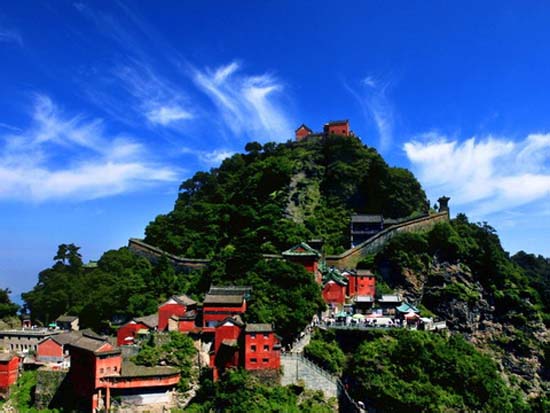 武當(dāng)山又名“太和山”,位于中國中部湖北省丹江口市的西南部。相傳為道教玄武大帝(北方神)修仙得道飛升之勝地, 歷代道教名流曾在此修煉。據(jù)記載, 唐太宗貞觀年間即在靈應(yīng)峰創(chuàng)建五龍祠。宋、元以來, 代有開拓?cái)U(kuò)建。明成祖于永樂十年(1412)曾動(dòng)用軍夫30多萬人在此大興土木?,F(xiàn)存的36處宮觀大多是明代所建, 是中國現(xiàn)存最完整、規(guī)模最大、等級(jí)最高的道教古建筑群。宮觀內(nèi)保存的各類神像、法器、經(jīng)籍等都有較高的文物和藝術(shù)價(jià)值。明代(公元1368~1644年)時(shí),武當(dāng)山被皇帝敕封為“大岳”、“玄岳”,地位在“五岳”諸山之上。武當(dāng)主峰天柱峰,海拔1612米,周圍又有“七十二峰”、“三十六巖”、“二十四澗”等勝景環(huán)繞,風(fēng)光旖旎,氣勢(shì)宏偉,被世人贊為“萬山來朝”。