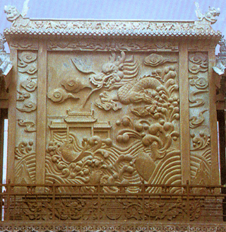 莊園大量的石雕,還是砂石作品。其石材多取于附近山中,質(zhì)地有白、綠、紅、青多種,主要用于橋、廳、臺、廊的護欄和柱體,半亭花墻、影壁和牌坊,刀法較青石作品粗獷、雄渾,畫面疏朗典雅、疏密得當、虛實和諧、古樸堅實,顯得特別有氣魄。杏壇、街心牌坊、祠堂獻廳圍欄、養(yǎng)和堂階欄、半亭、三星影壁和莊園西門魚躍龍門巨幅石額,就是砂石雕刻的代表作。