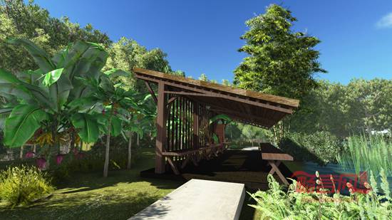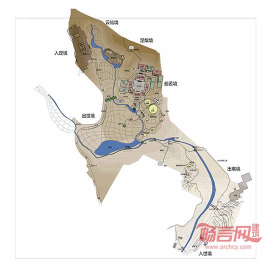 入世境為寺域前區(qū),作停車、暫時休整之用;山門為情境轉(zhuǎn)換媒介,拾階而上,山林夾道,洗滌心靈,是為出離境;寺院前部為平坦區(qū)域,以水田農(nóng)禪景觀為主,視野開闊,設置放生池,種蓮養(yǎng)魚,利用參天古樹和竹林營造自然茶室,茶亭茶室與植物互為取景,交相輝映,分布錯落有致,形成趣味的園林廊道系統(tǒng),一派世外桃源景象,是為出世境;寺廟殿宇區(qū)域為拜佛儀式及僧人居住生活場所,以唐風建筑及庭院為主,是為般若境;經(jīng)過禪堂,石階引向后山的祖師塔區(qū)域,在祖師塔上加茅草穹頂,暗示祖師結(jié)茅而居,是為涅槃境;寺廟后方沿山而建的禪修中心和善客堂,為禪修者提供的專修場所,用高大喬木和竹林與寺廟區(qū)分隔,獲得寂靜氛圍,是為入定境;后山密林深處,罕有人至,閉關獨居,悠然逍遙,是為云仙境。