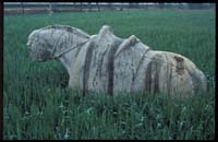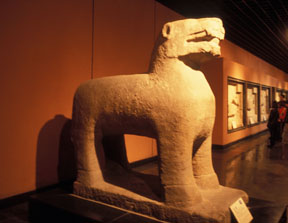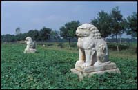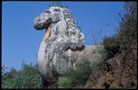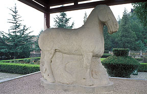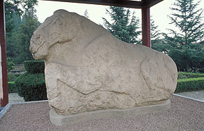 古代陵園石雕遺存實(shí)物最早的是引人注目的西漢霍去病墓石雕,作品原在陜西省興平縣漢武帝茂陵?yáng)|面霍去病墓上與墓前?,F(xiàn)已發(fā)現(xiàn)的石雕作品有造型各異、天趣宛然的動(dòng)物、人物等共十四件?;羧ゲ槲鳚h名將,漢武帝為表彰其功、紀(jì)念其人,于茂陵?yáng)|面選定其墓址并“為冢象祁連山”,據(jù)《史記?衛(wèi)將軍驃騎傳?索隱》記:其墓“冢上有豎石,前有石馬相對(duì),又有石人”。今存作品即記載中的部分原物。它們可以分為兩類(lèi),一是通常被稱(chēng)之為“馬踏匈奴”的立馬,二是其它渚石。立馬的原在位置是墓前不遠(yuǎn),長(zhǎng)年來(lái)未有大的移動(dòng),從形式上看為靜立姿態(tài),尺度適中,符合一般早期墓前石雕的制作規(guī)律,相信此即記載中相對(duì)而立的石馬,只是另一件已無(wú)存,“石人”也不見(jiàn)了。唐薛逢《漢武帝祠》詩(shī)云:“茂陵煙雨埋弓箭,石馬無(wú)聲蔓草寒”。詩(shī)中所指茂陵石馬當(dāng)系帝陵制度,但與霍墓立馬的位置及造型表現(xiàn)肯定有直接關(guān)系。西漢時(shí)期陵園墓前設(shè)置石雕已成風(fēng)氣,關(guān)于石人石獸的記載與遺存并不罕見(jiàn),因此霍去病墓前石馬并非例外,實(shí)屬常規(guī)設(shè)置,它為我們提供了代所完善的石象生設(shè)置與造型形式之源的現(xiàn)知最早實(shí)物證據(jù)。