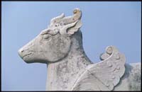 漢代墓葬手段逐漸完善之時(shí),神靈的偶像也大規(guī)模出現(xiàn),它們體現(xiàn)著人們對(duì)神的認(rèn)識(shí)、崇拜和依賴(lài),它被認(rèn)為會(huì)給陵墓帶來(lái)吉祥,給墓主靈魂以庇護(hù)和幫助,會(huì)驅(qū)逐鬼怪邪祟。魏晉南北朝時(shí)期這種偶像化更為明顯,為后代確定了神靈崇拜的偶像模式。陵園神道兩側(cè)列置著石雕天祿辟邪;墓室里陳放著陶塑的鎮(zhèn)墓獸;壁畫(huà)描繪著羽人、飛天、神靈;墓門(mén)棺槨上也刻劃著方相氏的形象。前代的這種審美表現(xiàn)因素影響著唐陵石雕藝術(shù)表現(xiàn)的一個(gè)重要方面,即歸結(jié)出天馬、天鹿等神靈崇拜的占有一定比例的造型表現(xiàn)部分。末陵石雕的角端、瑞禽明清陵園石雕的麒麟、獬豸等都是這種基礎(chǔ)內(nèi)容模式的演變。先民們?cè)噲D通過(guò)陵墓這一特殊的環(huán)境達(dá)到人與神的有效溝通,在這個(gè)意義上造型手段起著關(guān)鍵性作用。陵墓被視為人神共處的理想化的虛幻而可信的環(huán)境,在這里天國(guó)、人間、地獄融為一體,形成完整的世界??梢哉f(shuō),對(duì)神靈的崇拜心理和原始宗教的世界觀是決定墓葬表現(xiàn)形式的重要因素。