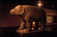 與石虎同列的石犀運(yùn)用著相似的寫(xiě)實(shí)手法,它明確強(qiáng)調(diào)了犀牛的褶皺皮膚和粗重身軀,真實(shí)刻劃著對(duì)象的體征。與石虎不同的是石犀身上刻有細(xì)密的魚(yú)鱗紋;這種非寫(xiě)實(shí)的線刻紋可能是顯示犀牛皮膚粗糙感的表意性處理。實(shí)際上在龐然大物表面分布的細(xì)密的魚(yú)鱗紋在拉開(kāi)視距觀察時(shí)給人的視覺(jué)感受正是皮膚粗糙感。