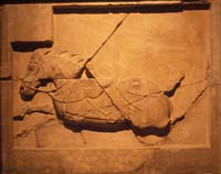 “昭陵六駿”,與其說(shuō)是表現(xiàn)雕刻的美不如說(shuō)是表現(xiàn)繪畫(huà)的美。據(jù)記載,昭陵是在杰出美術(shù)家閻立德主持下修建的,并由其弟閻立本圖繪十四國(guó)君長(zhǎng)像為石刻范本?,F(xiàn)存十四國(guó)君長(zhǎng)像頭部殘塊顯示的確有寫(xiě)真特征,面部皺紋用線刻形式加以表現(xiàn),甚至眼角的紋路亦不放過(guò),形象追求“寫(xiě)真性”,突出個(gè)人的容顏特點(diǎn),在某種程度上帶有一定的摹刻繪畫(huà)性,不同于一般的石人?!傲E”所表現(xiàn)的是唐太宗征戰(zhàn)慣用的六匹戰(zhàn)功馬,宋游師雄題《六駿碑》中記述了石刻當(dāng)時(shí)安置的次序:颯露紫(西第一)、特勒(勤)驃(東第一)、拳毛馬咼 (西第二)、青騅(東第二)、白蹄烏(西第三)、什伐赤(東第三)?!傲E”表現(xiàn)為類(lèi)似于漢畫(huà)象石刻中浮雕的形式,在方形外框中刻畫(huà)馬的側(cè)面形象,韻致非常接近于唐代繪畫(huà)中馬的表現(xiàn)?!傲E”是具體指象,即“刻石為常所乘破敵馬六匹”(《唐會(huì)要?卷二十》),有形象的特定要求,而且選擇了戰(zhàn)馬中箭、奔馳、療傷的情節(jié)并刻畫(huà)出了馬頸部的“三花紋”這類(lèi)細(xì)節(jié)。這都宜于繪畫(huà)表現(xiàn)而不宜于圓雕表現(xiàn)。既然人像石雕可以繪畫(huà)為范本,馬的石雕當(dāng)然也完全可能以繪畫(huà)為范本。昭陵沒(méi)有效法圓雕形式表現(xiàn)鞍馬,原因之一就在于類(lèi)似畫(huà)象石的浮雕形式更便于傳達(dá)繪畫(huà)性表現(xiàn)內(nèi)容,避免圓雕所受的材料限制,從而傳達(dá)“六駿”特有的紀(jì)實(shí)性審美意味。