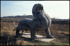 中原地區(qū)從戰(zhàn)國(guó)秦漢興起的在墓前設(shè)置石雕人物、動(dòng)物雕像的風(fēng)氣在唐代已經(jīng)波及到少數(shù)民族居住地區(qū),但由于各自不同的生存環(huán)境、文化傳統(tǒng)、生活方式及受到外來(lái)文化影響程度等原因,石雕作品的內(nèi)容與形式和中原密切聯(lián)系的同時(shí)又有明顯差異。位于吉林省敦化縣的渤海國(guó)前期王族墓地現(xiàn)存石獅兩尊,造型與中原唐陵早期作品十分相似,同時(shí)不失北方部族藝術(shù)的雄渾質(zhì)樸風(fēng)氣,顯示了中原文化的明顯滲透。