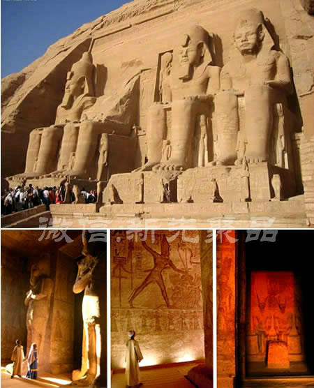 阿布辛貝位于埃及與蘇丹交界,公元十三世紀(jì)時,這所宮殿是給當(dāng)時在位67年的法老拉美西斯二世修建的。二十世紀(jì)六十年代,由于納賽爾湖水的上漲,建造阿斯旺大壩的時候,為了防止被淹,神廟被切割成石塊遷移至高于河床的后山上再重新按原樣完成組裝。