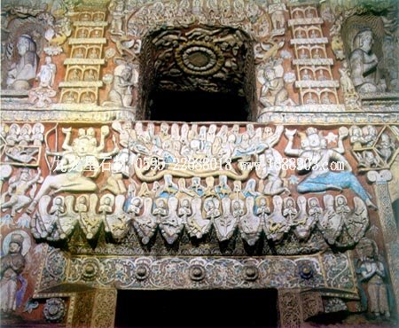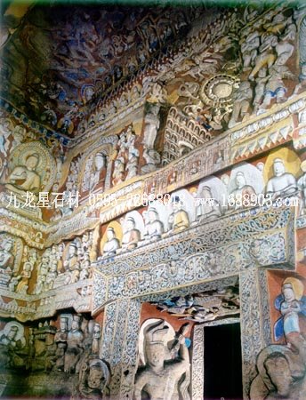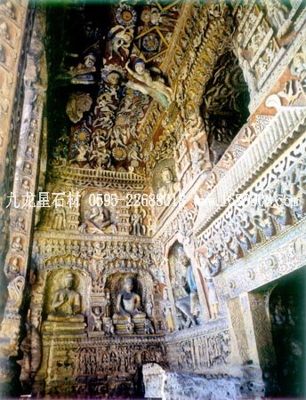 石窟位于山西省大同市西北的武州山北崖上,是我國三大石窟之一,距今已有1500多年的歷史。整個(gè)石窟依山開鑿,東西綿延1公里,現(xiàn)存主要洞窟53個(gè),大小造像51000多個(gè)。石窟雕刻的題材內(nèi)容,基本上是佛像和佛教故事。石窟中最大的佛像是第五窟三世佛的中央坐像,高達(dá)17米。佛像形態(tài)端莊,是中原文化傳統(tǒng)的表現(xiàn)手法,但其臉部形象:額寬、鼻高、眼大而唇薄,卻具有外域佛教文化的某些特征。