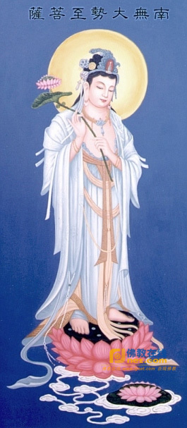大勢至,音譯摩訶娑太摩缽缽羅缽跢。意譯作“得大勢”、“大精進(jìn)”。略稱勢志菩薩、勢至菩薩。此菩薩以智慧光普照一切,令眾生離三涂,得無上力;又彼行時,十方世界一切地皆震動,故稱大勢至。與觀世音菩薩同為西方極樂世界阿彌陀佛之脅侍,世稱西方三圣。首楞嚴(yán)經(jīng)卷五念佛圓通章謂,大勢至菩薩于因地時,以念佛心入無生忍,故今攝此娑婆世界之念佛眾生,歸入凈土。又依悲華經(jīng)卷三載,當(dāng)阿彌陀佛入滅后,由觀世音菩薩補其位;觀世音入滅后,則由大勢至補處成佛,掌握化權(quán),號善住珍寶山王如來。