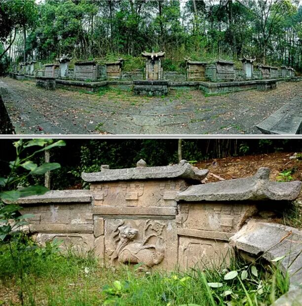 上圖:喬亭馮氏螃蟹形山墓群全景;下圖:祖墓馮伯達(dá)墓環(huán)墉上的麒麟浮雕該墓葬位于赤岸鎮(zhèn)喬亭村下西山螃蟹形山,墓向坐西北朝東南,共有墓葬11座。以祖墓馮伯達(dá)墓為核心,左昭右穆排列,符合傳統(tǒng)的禮制。墓前有供子孫祭奠的甬道、祭臺(tái)和三級拜臺(tái),還有月池。每座墓前設(shè)石供桌一張,石供桌束腰和圭腳等部位淺浮雕盤長、方勝與如意云頭等紋飾。墓前立石碑,刻墓主身份、行號(hào)等,廡殿頂碑額,以一斗三升斗栱挑檐。左右兩側(cè)石欄板圍護(hù),有單鉤欄,也有重臺(tái)鉤欄,欄板上浮雕朱雀、麒麟、仙鹿、天馬等祥瑞圖案。墓包土封,設(shè)環(huán)墉。馮伯達(dá)墓屋環(huán)墉上高浮雕麒麟回首圖案,刀法蒼勁古樸,工藝精湛。
