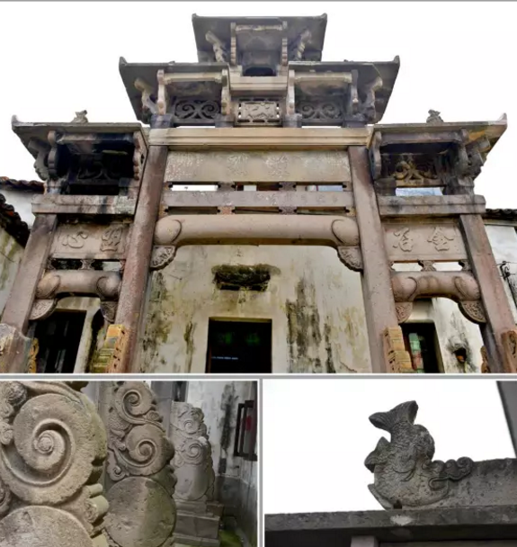 祠建于明嘉靖二十七年(1548),由大理寺卿前右副都御史虞守愚立。大門采用單間石雕牌樓門,門梁兩頭雕卷草如意紋作為邊框,中間的重檐歇山樓閣式建筑象征龍門,龍門下端祥云托護(hù),龍門右側(cè)翻波逐浪,騰蛟起舞,一條巨龍騰云駕霧而來,四周祥云繚繞。龍門左邊麗日高懸,水波浪以陰線刻束絲波紋、齒形浪紋,三尾鯉魚在海浪中躍躍欲試,半個(gè)身子露出水面。其中一條鯉魚前半身已躍過龍門,成為龍首魚身的鰲魚,與右邊的蛟龍呈呼應(yīng)姿勢,是典型的魚化龍題材。民間以登科及第比喻鯉魚跳龍門,表達(dá)出古代科舉制度下讀書人對布衣卿相的渴望。門額上方的龍門枋淺浮雕琴、簫、書、畫等圖案。