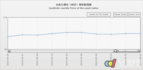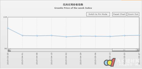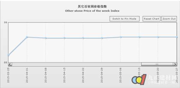 據(jù)“中國·水頭石材指數(shù)”系統(tǒng)監(jiān)測,20150527期石材周價格指數(shù)收報于98.71點,環(huán)比略上浮0.08點,上浮約0.08%。本周石材價格指數(shù)延續(xù)上周穩(wěn)中微升的趨勢、繼續(xù)微幅推升,其中其他石材類價格環(huán)比持平外,大理石、花崗石、合成大理石類價格均有所回升。大部分品類價格變化仍較穩(wěn)定,部分品種價格因市場需求有所增加及板面質(zhì)量差異小幅上揚(yáng)。
