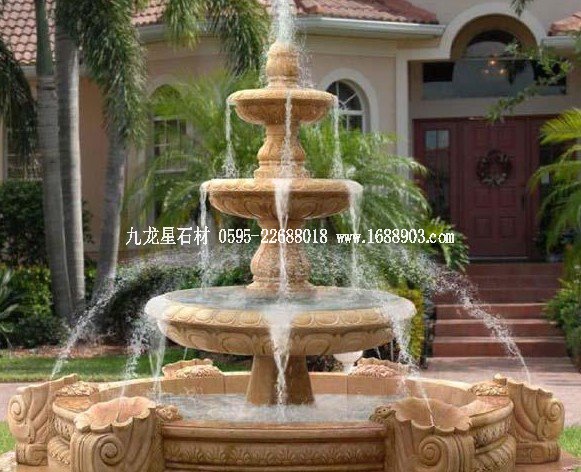 黃金麻石材噴泉雕塑凈高約2.1米,最大缽盤直徑為0.8米,表面蘑菇面處理。