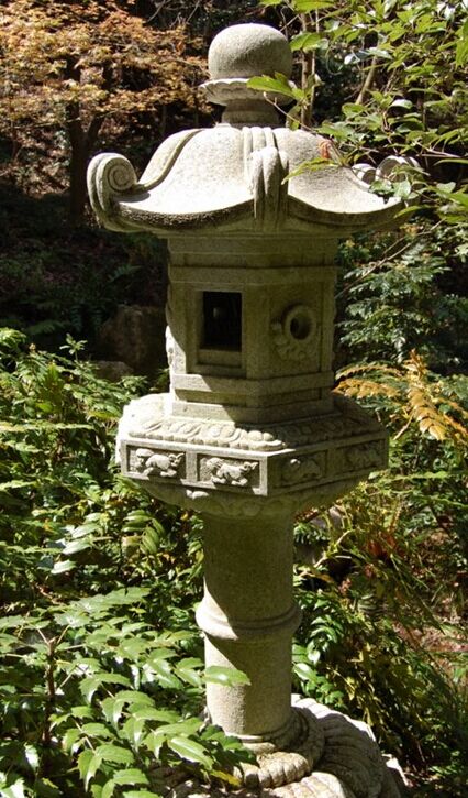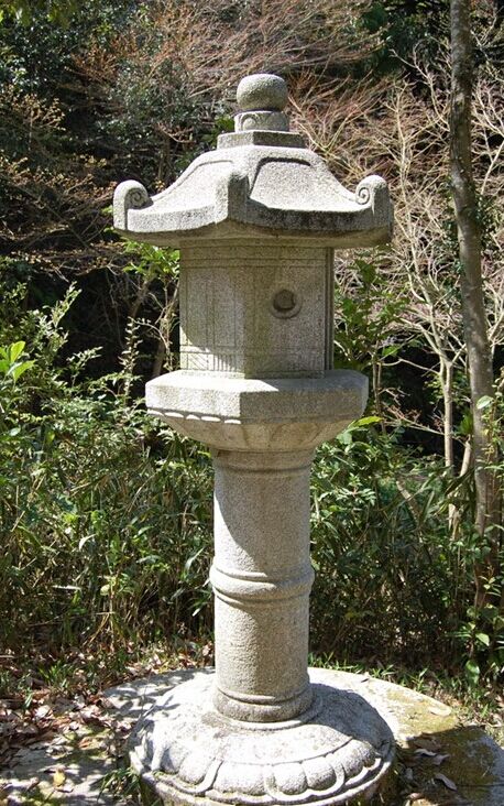 石燈籠的基本構(gòu)造:基礎、燈柱、中坐、火袋、燈頂、寶珠,一般在燈柱的兩端和寶珠的下部雕刻有蓮花的紋案。