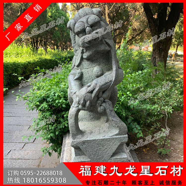 石雕獅子大體是漢族傳統(tǒng)文化中常見的辟邪物品之一。宮廷石獅一般置于宮殿、陵墓前,在形體力度和內(nèi)在精神氣勢上氣吞山河、威猛雄壯;宗教石獅多出現(xiàn)于佛教寺廟石窟之中,其形象對之后中國石獅造型的演變產(chǎn)生很大影響;民間石獅最普及也最有生命力,百姓把獅子看成能驅(qū)惡辟邪的瑞獸,因此,在民間數(shù)量最多的是牌坊門墩獅和鎮(zhèn)宅獅,此外,還有拴娃獅、壓繃獅、印紐獅等等。造型的隨意性和夸張性是民間獅子形象的一個突出點,格調(diào)清新,情趣盎然,并運用象征、會意、諧音等手法來創(chuàng)作石獅形象,賦予了喜慶吉祥色彩,充滿著濃郁的生活氣息。