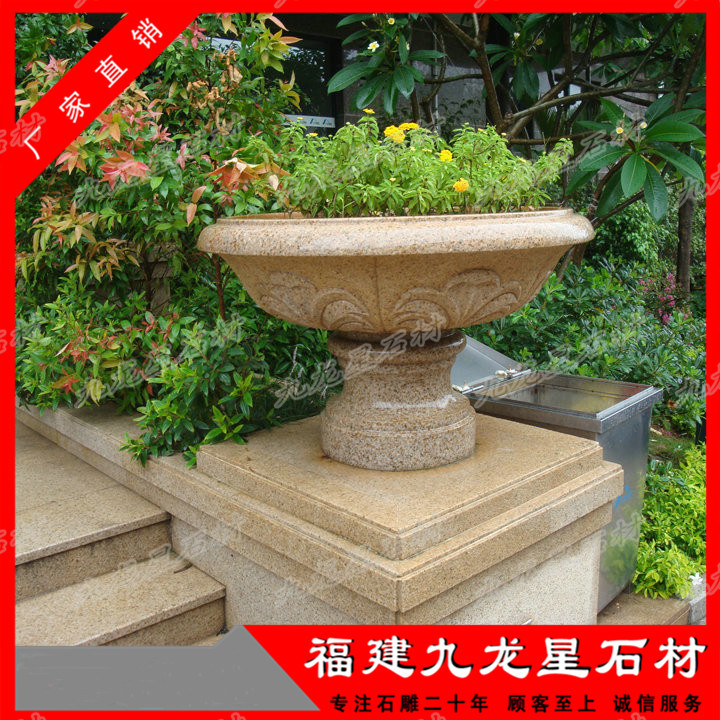 石材花缽是種花用的器皿,為口大底端小的倒圓臺或倒棱臺形狀,質地多為砂巖,黃繡石,莆田繡,大理石,花崗巖。近年來,一些大型廣場、繁華鬧市等特殊地段,由于實施黃土不露天工程,因此這類地段的綠化美化大多通過使用各類花缽來實現(xiàn)。